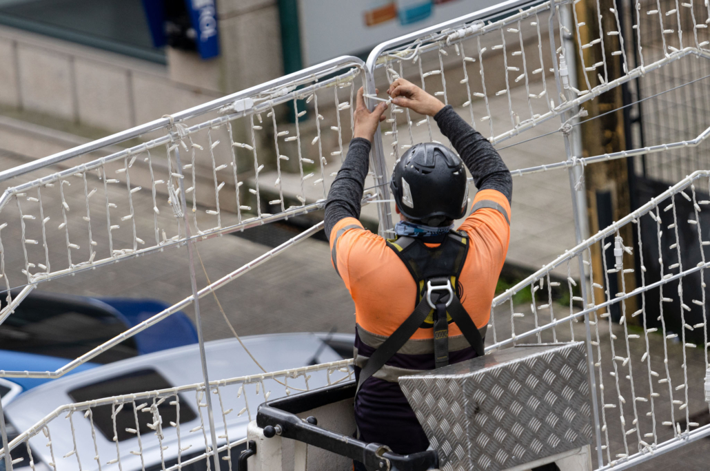 Mężczyzna zawieszający świetlną dekorację świąteczną